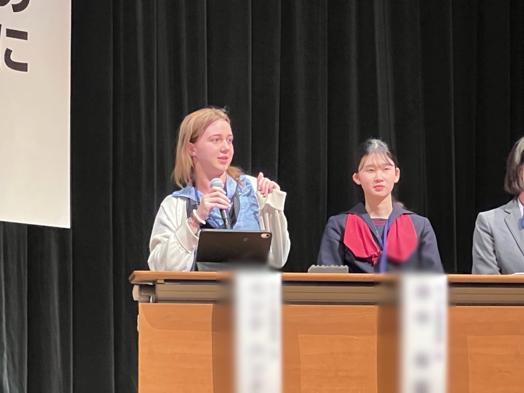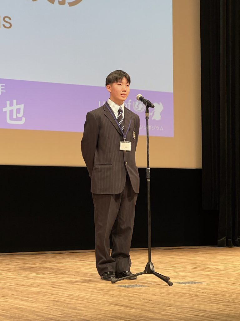 大人になったときの地球の理想像を考え、その中で「人間も自然の一部」との考えのもと経営している企業を取り上げた。2001年から太陽光パネルを設置、いまでは工場のすべての電気を賄う。また、集光器で工場内に太陽の光を取り込んでおり、社員食堂では食材クズを発酵させ畑へまき収穫物はまた食堂へと持続可能なサイクルを作り出している。このような理想の将来像を実現するには、SDGsや環境問題を学ぶ機会が重要だということがわかった。アンケートで明らかになったことは、個人だけでなく企業や行政と協力すべきだという結果だった。子ども時代から環境問題を考えることにより環境を考える意識が高くなる。まずはここにいる全員が、そしていずれは世界全体がこの事を考えることが当たり前となる社会を作るために協力していきましょう。